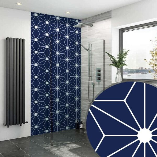 Crafted from a 3mm thick acrylic sheet, each panel features a reverse-printed navy blue tiled pattern on the back, protected by a silver foil layer. This ensures a smooth, easy-to-clean surface while maintaining the design’s sharpness and vibrancy. The foil backing guarantees extended durability and protection.
