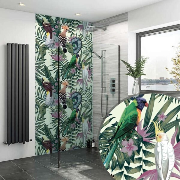 The Tropical Birds 005 Shower Panel adds a vibrant and stylish accent to modern bathrooms. Designed for both aesthetic appeal and functionality, this panel features colorful tropical bird patterns while offering effortless maintenance.