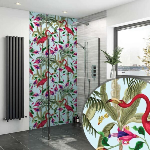 The Vintage Flamingo Tropical Shower Panel by SplashBax adds a vibrant, tropical flair to modern bathrooms, featuring an elegant flamingo design that instantly elevates your shower space. These panels combine style with practicality, offering a low-maintenance, visually striking solution for contemporary interiors.