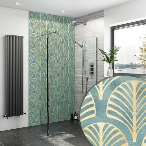 The Vintage Gold Teal Palms Shower Wall Panel brings a bold yet elegant tropical look to modern bathroom spaces. Combining rich gold tones with teal palm detailing, this panel is designed to enhance interiors while remaining practical and low maintenance.