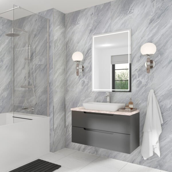 Brera Marble combines a grey marble look with veins of white to create a luxurious feel in your bathroom.