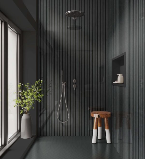 The SplashBax Black Oak Acoustic Slatted Shower Panel is a contemporary and practical solution for modern bathroom interiors, offering the warm look of black oak slatted panels with a sleek, grout-free finish. Ideal for showers and wet areas, it delivers a high-end aesthetic with minimal maintenance and easy cleaning.