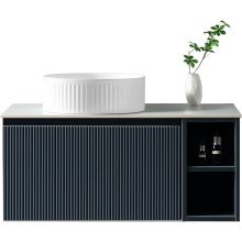 The Flauto Wall Hung Vanity Unit comes complete with a sintered stone worktop which has been pre-drilled single drawer unit with premium soft close runners and a side storage box with shelf.