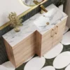 The Nuie Arno Bleached Oak Right Hand Floor Standing Unit And Marble Effect Basin is a practical choice for bathrooms that need storage and basin space in one unit.