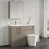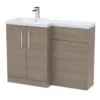 The Nuie Arno Solace Oak Floor Standing Unit And Basin is a practical choice for bathrooms that need storage and basin space together.