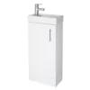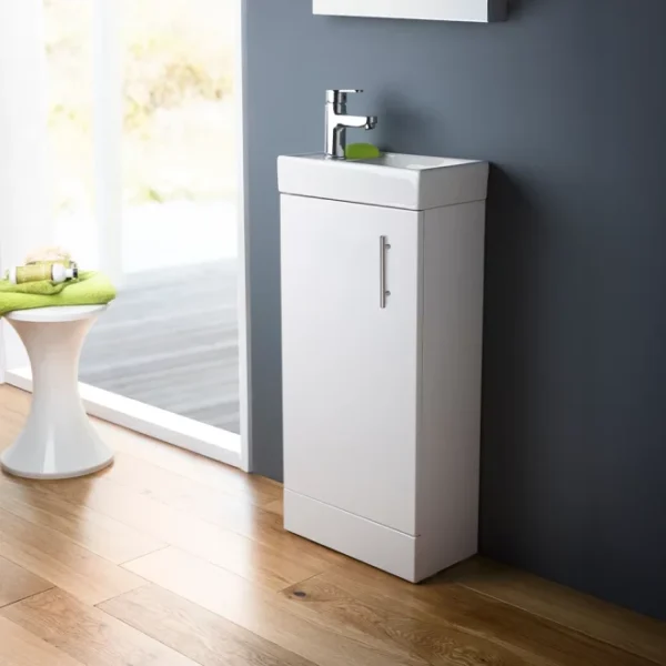 The Nuie Vault Gloss White 400mm Floor Standing Cloakroom Vanity Unit With Ceramic Basin is a practical choice for cloakrooms and smaller bathrooms.