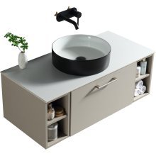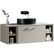 The Piatta 1000mm Countertop Unit comes complete with a single soft close drawer vanity unit, two storage boxes with shelves, and a preformed & pre drilled white sintered stone counter top suitable for a range.