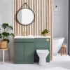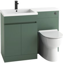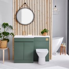 A calming and organic atmosphere is introduced to the washroom by the Scudo Empire 1100mm Sage Green Bathroom Furniture Set. Create a coordinated furniture run with the Empire combination unit by pairing the spacious 600mm vanity with the matching WC unit and a seamlessly integrated 1100mm stone basin. This floor-standing arrangement can be further extended with a tall boy unit to maximise storage across a larger wall area.