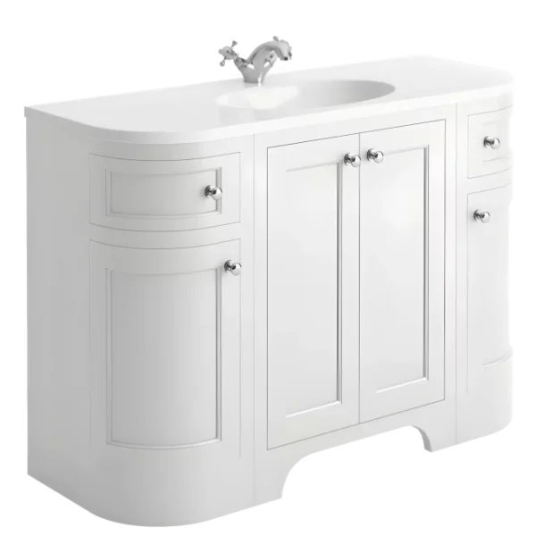 This vanity unit features an arctic white finish over a water-resistant high-density wood carcass. It offers six doors with soft-close hinges and comes complete with standard chrome cup handles providing both quiet operation and a polished aesthetic. The reinforced MDF delivers superior rigidity and longevity while the interior space helps keep toiletries neatly stored and your surfaces clutter free. This traditional vanity unit pairs perfectly with taps from our traditional range.